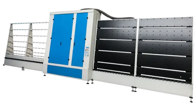 Une laveuse verticale est une machine utilisée pour nettoyer et sécher des feuilles de verre plat pendant qu’elles se déplacent verticalement à travers des brosses rotatives et des jets d’eau à haute pression. Elle est généralement utilisée avant des étapes de traitement ultérieures telles que le laminage ou l’assemblage de vitrages isolants (thermos).