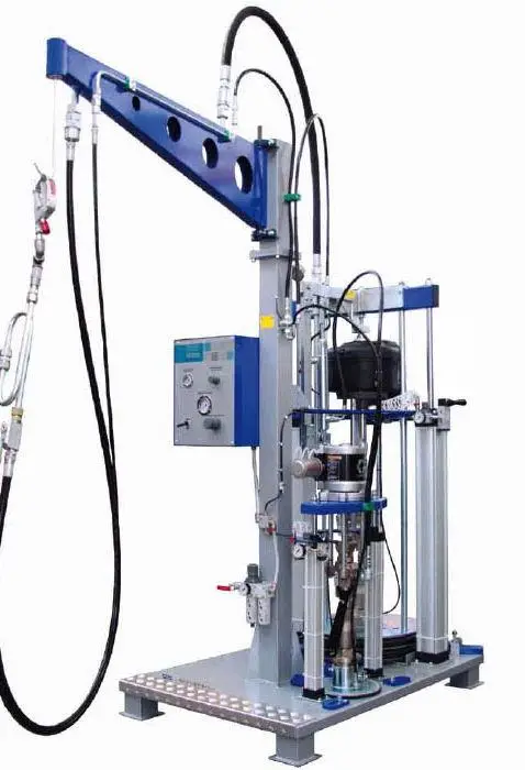 Cette machine est utilisée dans la fabrication des unités scellées (thermos) pour mélanger et appliquer automatiquement le scellant d’étanchéité bi-composants (comme le polysulfure ou le silicone). Elle fonctionne avec un système pneumatique avec un baril de 200 litres et une chaudière de 20 litres.